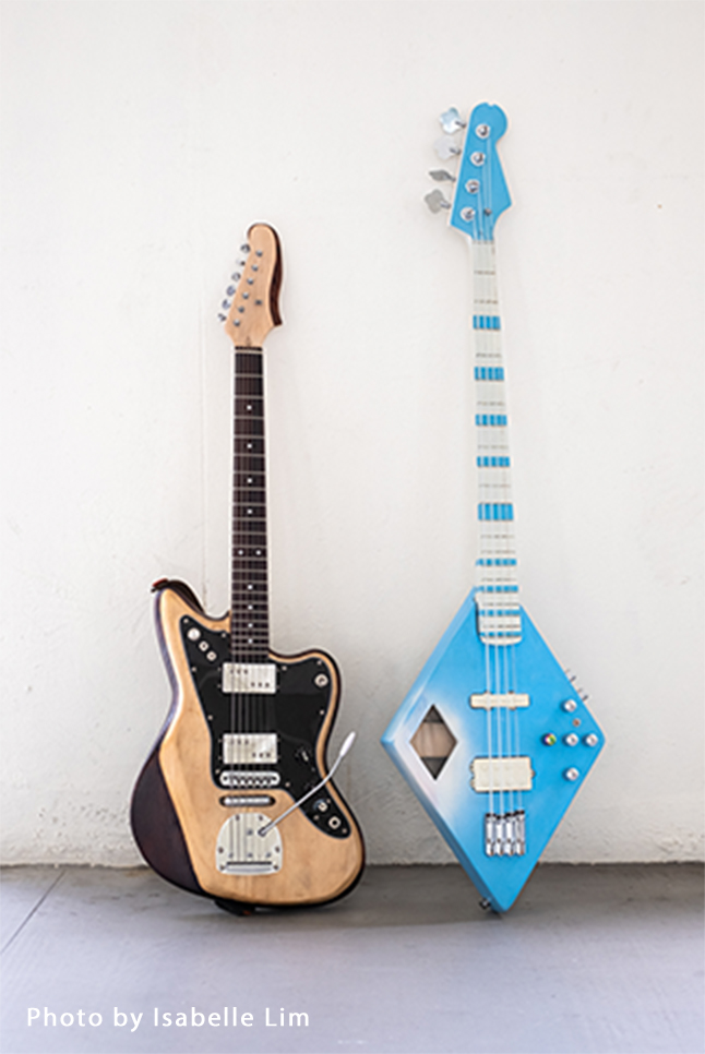 Doran, with guitars he built for brother Darius and himself. The bass, which took him a year to complete, has a cool, distinctive and ergonomic design.