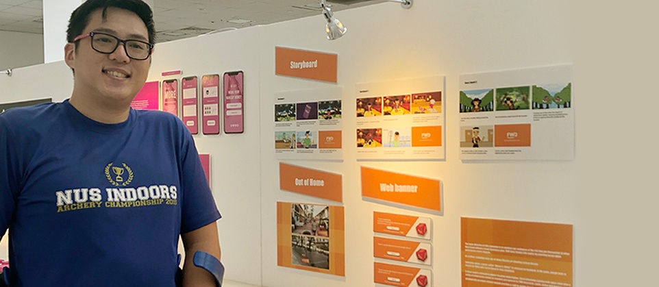 Alex Lim at NAFA Grad Show (2019) with his final year project "Risk is everywhere" for FWD, an insurance company in Singapore.