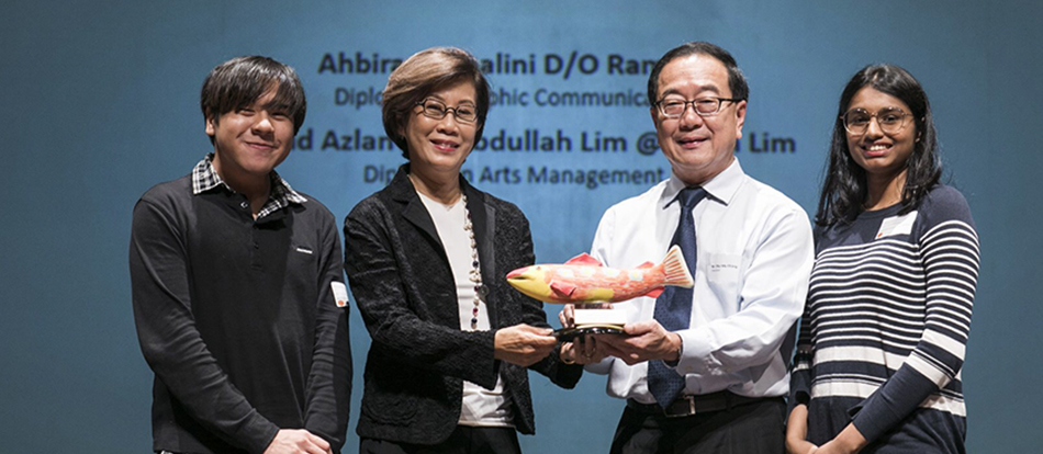 Ahbi Shalini (right) is our Dare to Dream (2019) student at NAFA, our first to be pursuing a Diploma in Graphic Communication. Pictured here together with Natara Aaliyah Lim (2018 recipient), Mrs Tan Shook Wah (Founder, Dare to Dream) and Mr Chia Mia Chiang (NAFA President) on 16 August 2019 at the NAFA Scholarship & Awards ceremony.